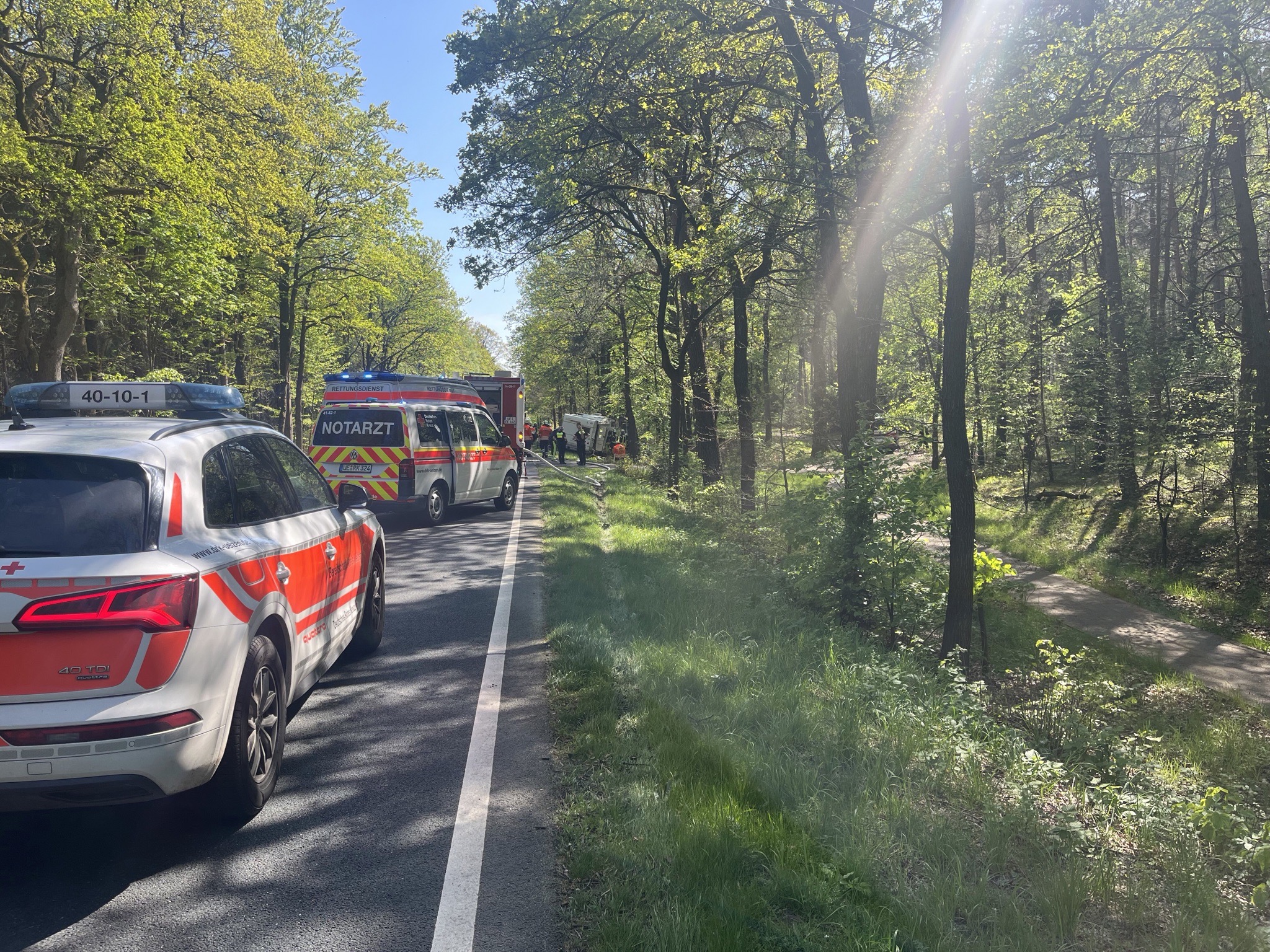 Am heutigen 1. Mai kam es gegen 15.00 Uhr auf der B4, zwischen dem Suderburger Kreisel und Breitenhees, zu einem schweren Verkehrsunfall. Aus ungeklärter Ursache verlor der Fahrer eines Wohnmobils die Kontrolle über dieses, geriet in den Seitenstreifen und kam letztendlich an einem Baum zum Stehen.