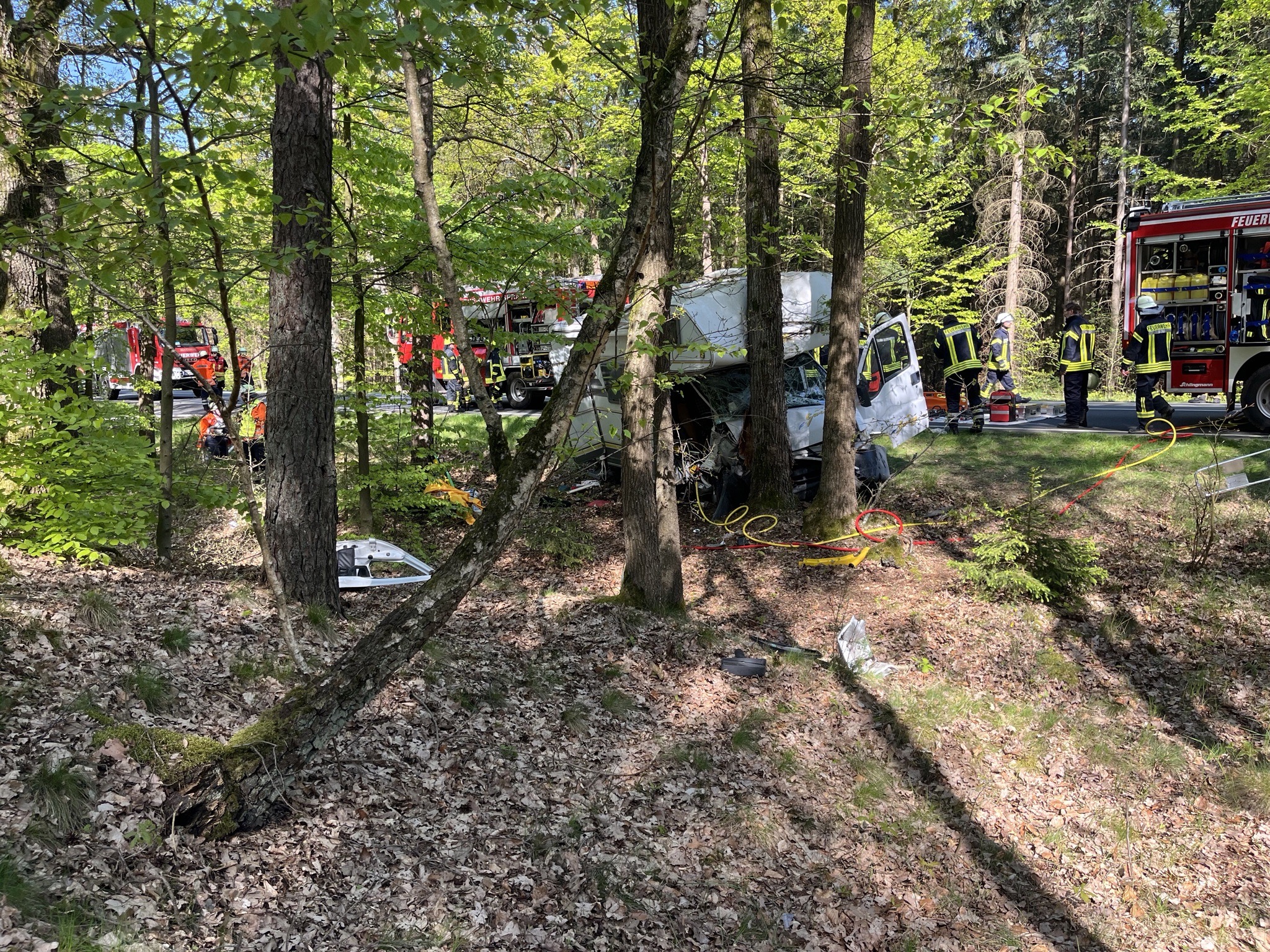 Da das Wohnmobil mit der Beifahrerseite frontal an einem Baum endete, musste die schwerverletzte Beifahrerin mit schwerem Gerät aus dem Wohnmobil gerettet werden.