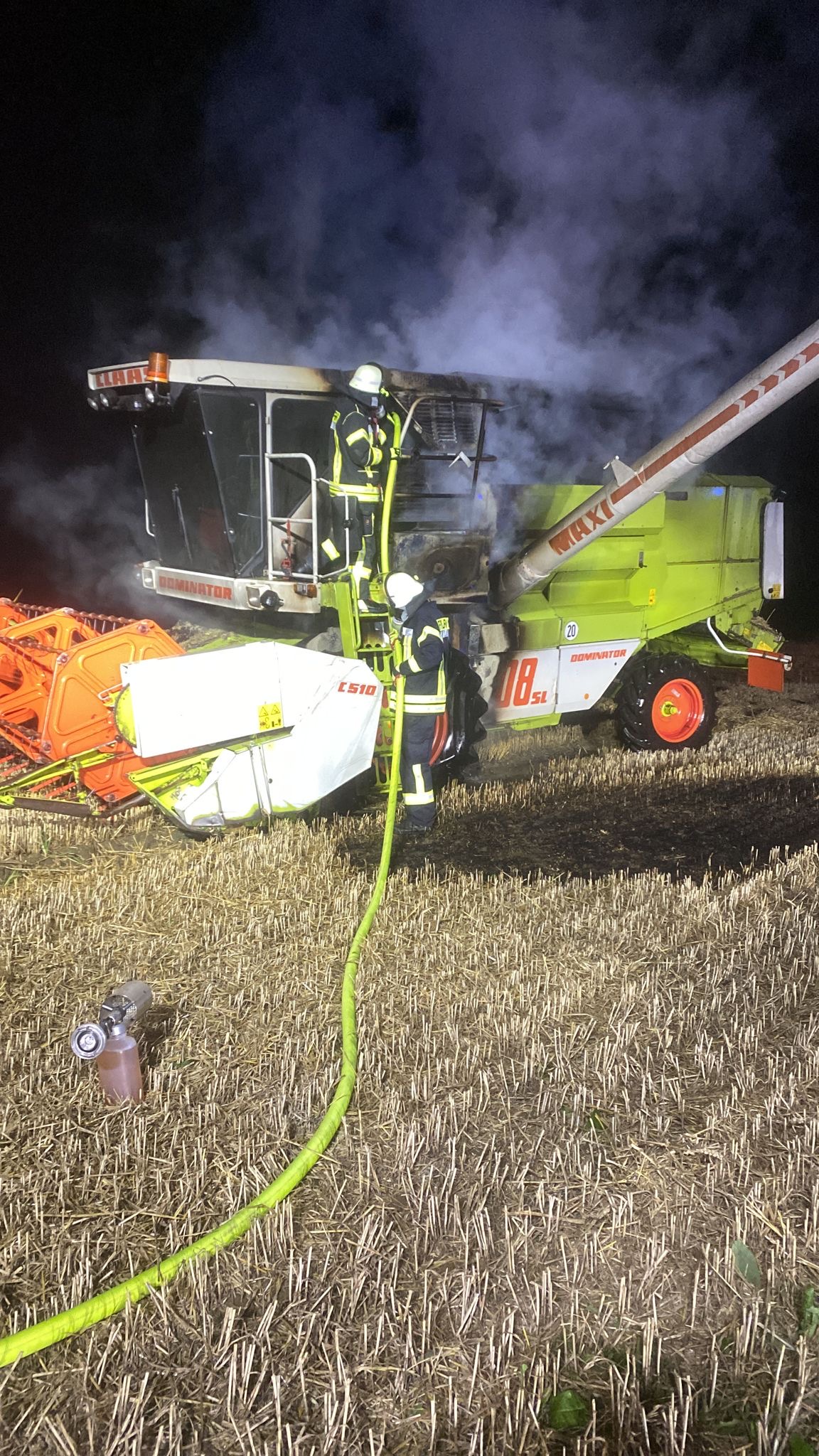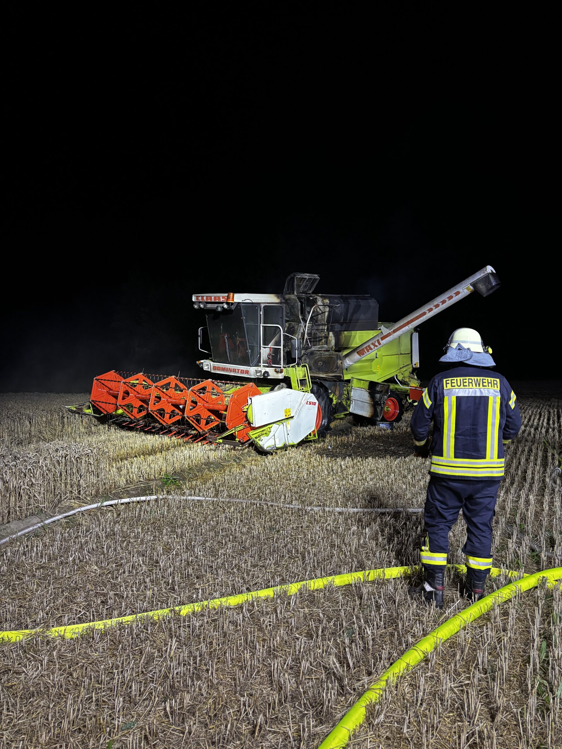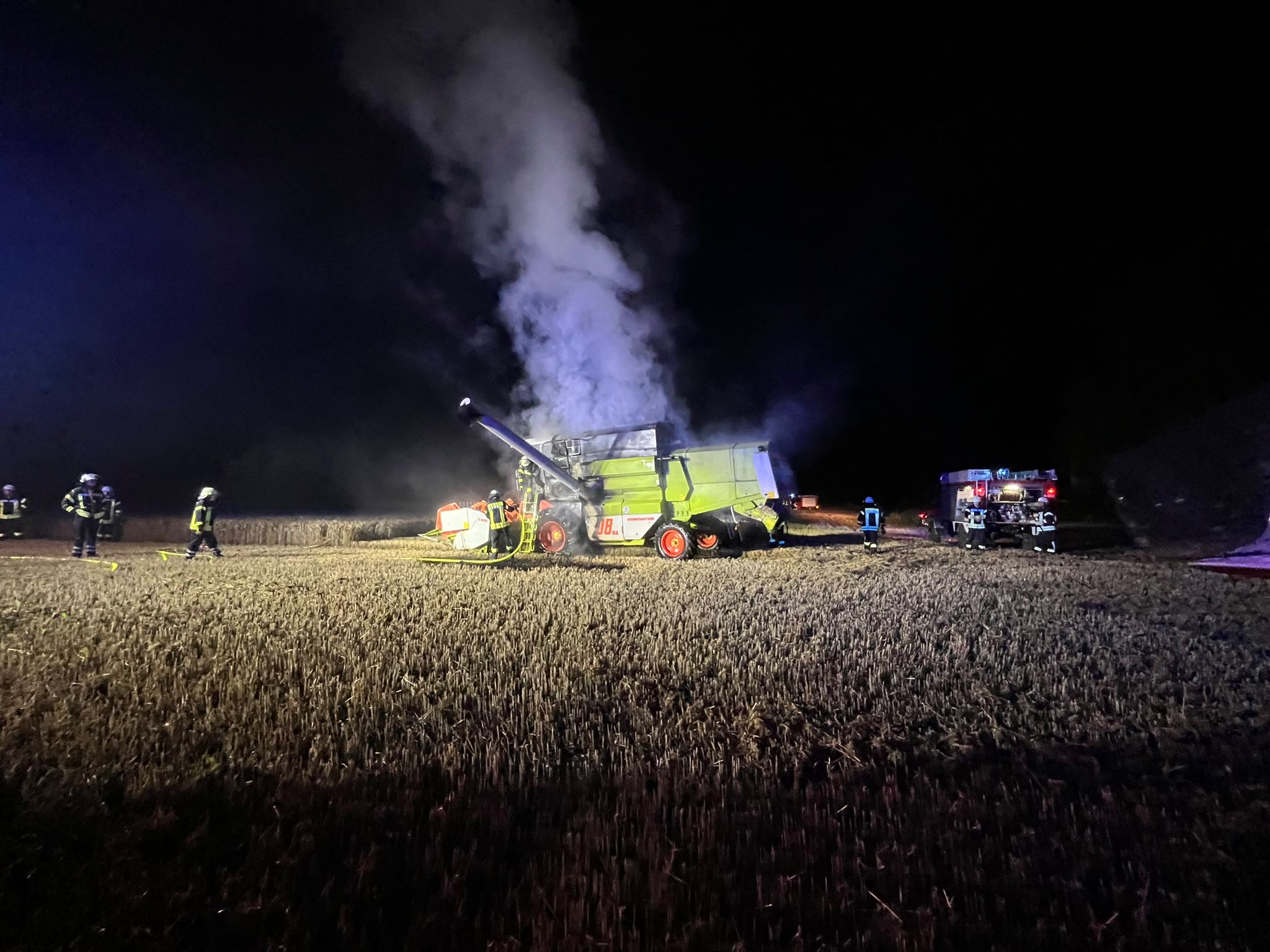 Beim Eintreffen unseres Tanklöschfahrzeugs stand der Mähdrescher in Vollbrand, die Ausbreitung auf das stehende Getreide war minimal. Der Landwirt hatte bereits eine Zugmaschine mit Grubber organisiert, um eine mögliche Brandausbreitung auf das Feld zu verhindern.